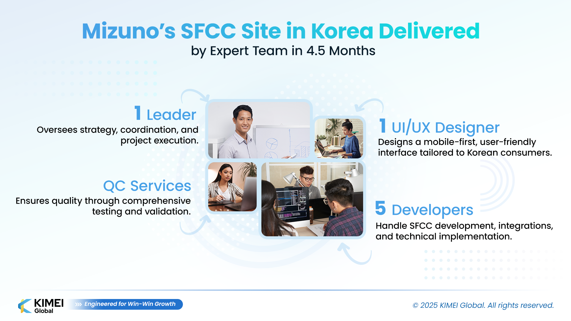 This structured approach ensures the delivery of a robust, localized SFCC site within 4.5 months, positioning Mizuno for success in Korea’s competitive e-commerce market.